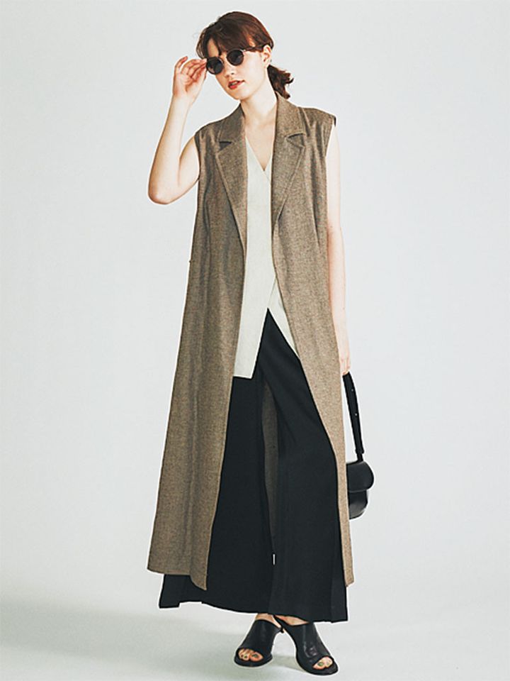 【POINT】腕の出るノースリタイプで選べば、レイヤードも重たく見えない。合わせるワイドパンツやサンダル、バッグを引き締め効果の高い黒でまとめ、品よく見せながら力が入りすぎないたたずまいに。