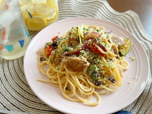 なんともおしゃれなパスタが、麺を茹でて、材料を炒めたらあっという間に完成です。生パスタにまぐろの旨みがしみ込んで、ごろっとした身も食べ応えがありました。上にかけたにんにく・パセリ・レーズンの味が楽しいサクサクパン粉が味の決め手です。