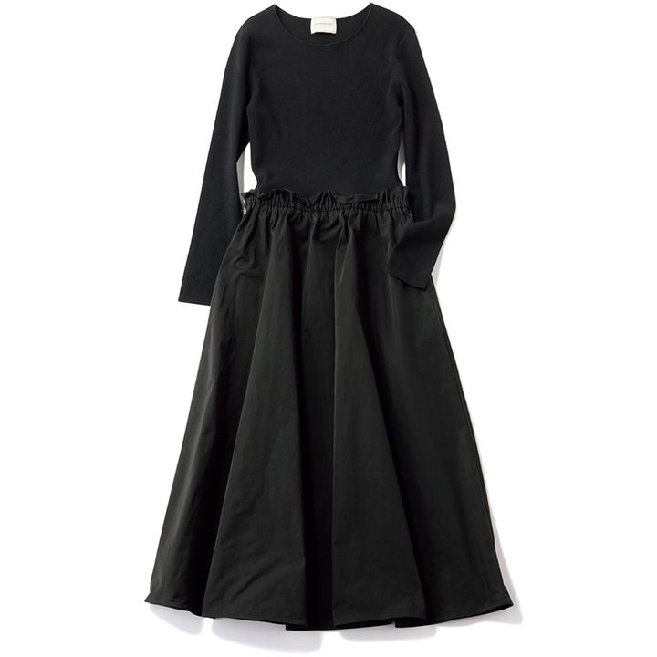 トップスとスカートを組み合わせたように見える、ドッキングワンピースも要チェック。一枚でサマ見えするためワンマイルシーンでも手抜きに見えず、忙しい朝の時短にも役立ちます。黒ワンピースで陥りがちな地味見えを、華やかな印象に導いてくれるのも嬉しいポイント。