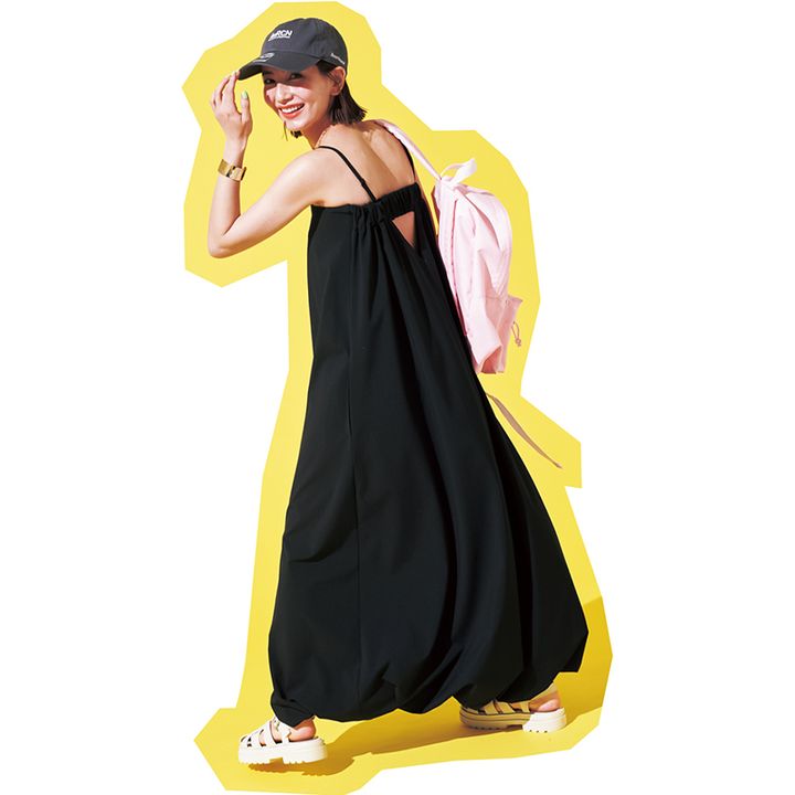 旅行シーンでは、普段なかなかトライしにくいバックオープンデザインで大胆な肌見せを楽しむのも◎。 潔く肌を見せることで黒でも涼やかな印象をアピールできます。キャップやスポサンは淡色を選び、優しげスポーティに味付けするのが今っぽく決まる秘訣です。