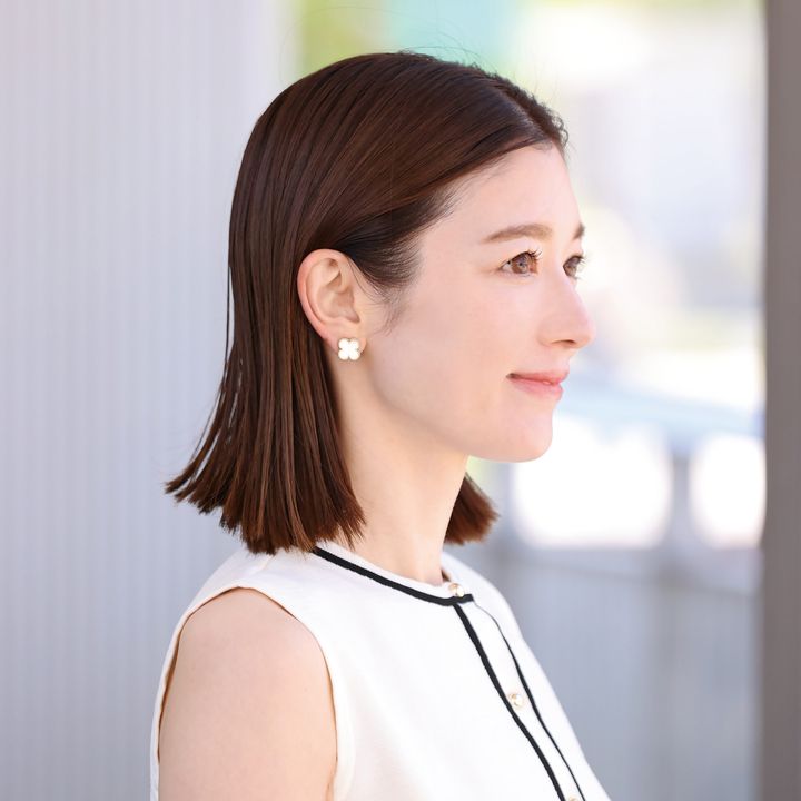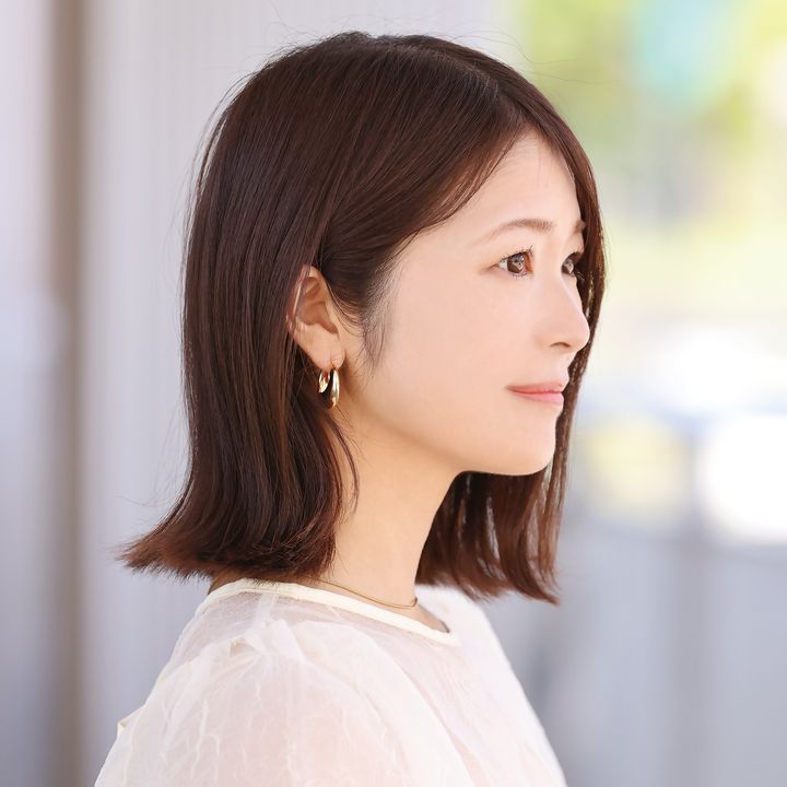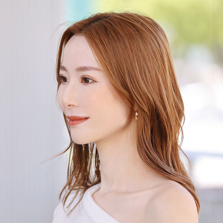 ストレートアイロンで軽くクセを伸ばした後、毛先だけをカールアイロンでハネさせています。ウェットな質感にしたいので、しっとりめのナインのオイルで仕上げています。カットはACOT hair designの篠田さんに。