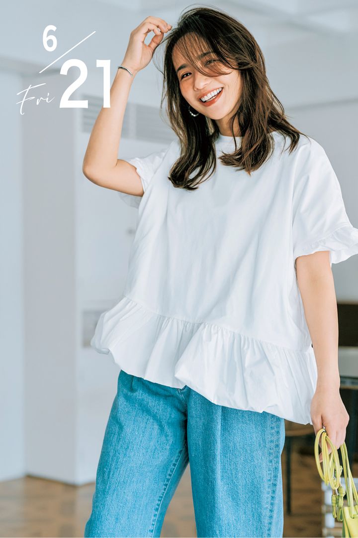 爽やかな白×薄色デニムのコーデは、トップスに甘めデザインを採用することでキレイめに。ゆるデニムと合わせるのが気分!