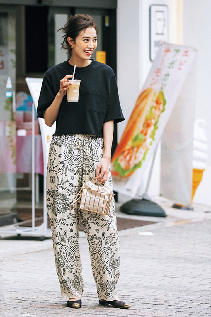 <第5位> 『ボタニカル柄のパンツ』も黒Tを合わせてリラクシーに!