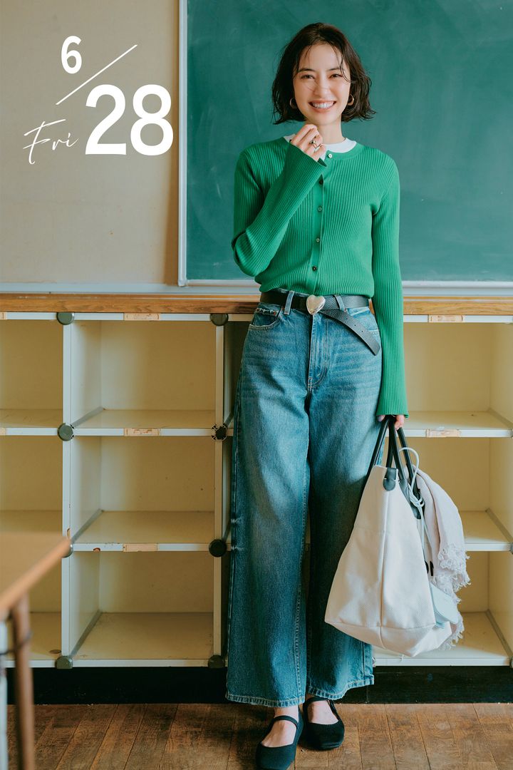 デニムパンツ¥56,100(ビーサイド ジーンズ)カーディガン¥17,600(ランバン オン ブルー)Tシャツ¥4,950(ビーミング by ビームス)ピアス¥31,900(ブランイリス)リング[右手薬指]¥48,400[右手薬指]¥46,200(ヴイエー ヴァンドーム青山)ベルト¥22,000トートバッグ¥47,300(A VACATION)トートに下げたミニバッグ¥17,050(ヤーキ)ストール¥29,700(アソース メレ)シューズ¥17,050(オッフェン)