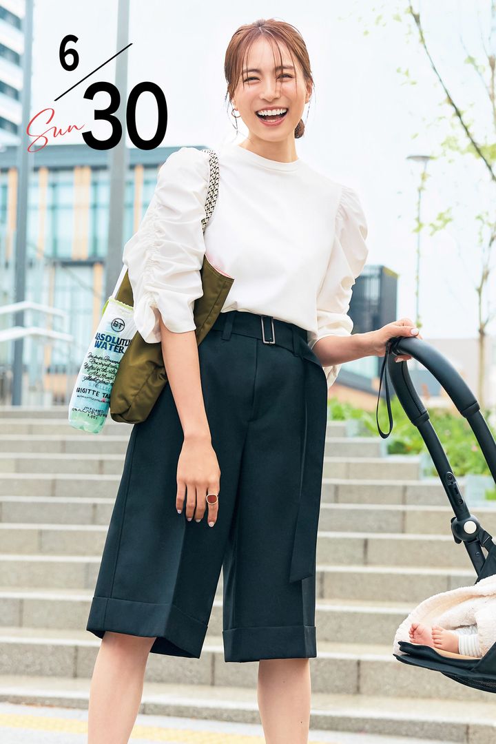 「抱っこ紐で洋服の身ごろがシワになったり隠れてしまう」そんな日は、袖にボリュームやデザインを効かせてオシャレ欲を満たして!短すぎないショートパンツなら大人っぽく。