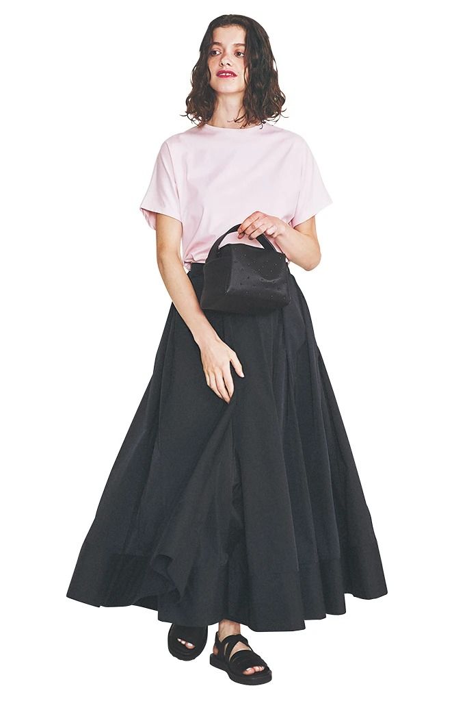 モノトーンよりもエッジが効かない、透明感のあるピンクTを黒の相棒に。色もシルエットも重厚感のあるスカートを軽く見せたいときにも好都合。