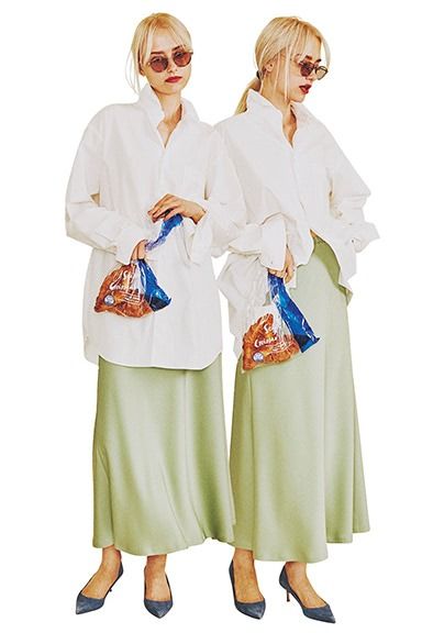 オーバーシャツとナローなサテン。着くずすほどセンシュアルな新発見。それだけで女っぽい、波打つようなサテンの質感を頼りに、白シャツはあえて適当にまとった計算高さ。着くずしたバランスがだらしなく見えないように、足元は色もフォルムもキレイなパンプスを。