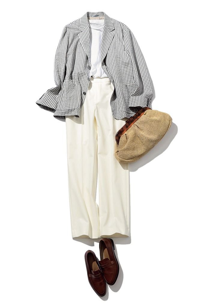 白っぽいトーンでつなげた上下のすっきりとした雰囲気をそのままに、風格をプラスするジャケットの存在感。気楽な白Tが抜けとして効果的に作用。