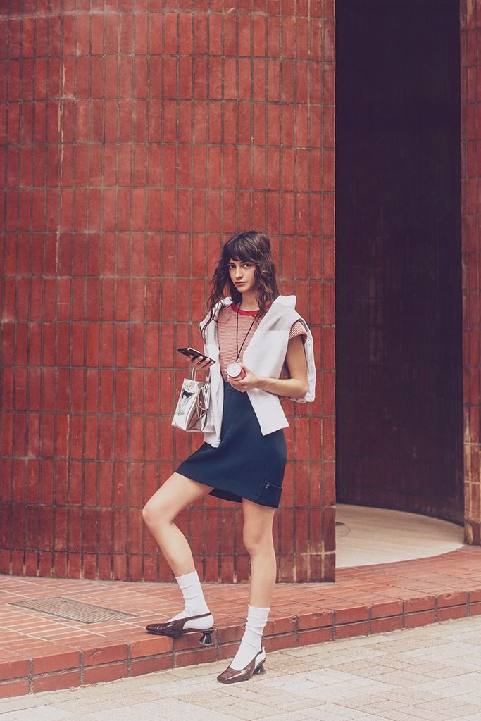 ミニスカート 47,300円、肩がけしたスウェット 29,700円/ともにSEA(エスストア) ボーダートップス 19,800円/KURO(ブルース) ネックレス 4,400円/LAGUNAMOON(LAGUNAMOON ルミネ新宿2) バッグ 10,900円/チャールズ&キース(CHARLES &KEITH JAPAN) シューズ 59,400円/AKIRANAKA(ハルミ ショールーム) ソックス/スタイリスト私物