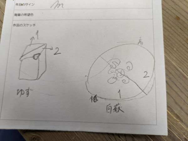 因みに700グラムの粘土をどう使うかは自由なので、湯呑を4個作ったり、大きめのお皿を2枚作るとうこともできますよ。 そして焼き色は、1つの作品でグラデーションにもできるので、それをお伝えすべくスケッチをして終了です。