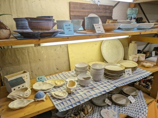 最近は電動ロクロのコースも人気だそうです。月通い放題のフリータイムコースなどもありますので、詳しくはホームページをご覧ください。 上手な生徒さんの作品も、販売しています。家で飾り切れないほど作っている方もいるそうです。