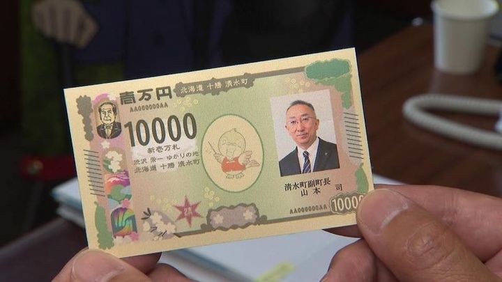 清水町では、新紙幣発行に向け、役場に垂れ幕を設置したり、Tシャツやバッジといった記念グッズを作りました。
