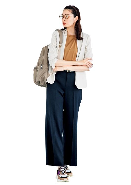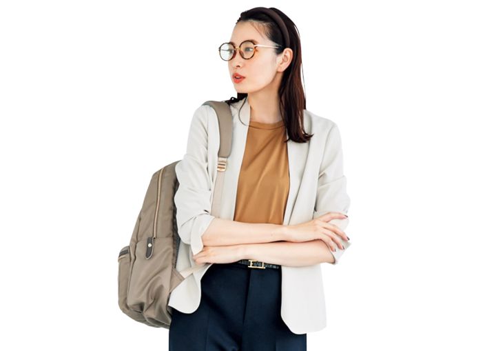 キャメルカットソー¥9,900/IKITSUKE(IKITSUKE笹塚店) ジャケット¥18,700/グリーンレーベル リラクシング(ユナイテッドアローズ グリーンレーベル リラクシング ルミネ有楽町店) パンツ¥14,960/インディヴィ(ワールド) リュックサック¥15,950/ペルケ(アンビリオン) マルチカラースニーカー¥19,800/MANA ベルト¥8,800/アンタイトル カチューシャ¥22,000/アレクサンドル ドゥ パリ(アレクサンドル ドゥ パリ GINZA SIX店) メガネ¥990/GU
