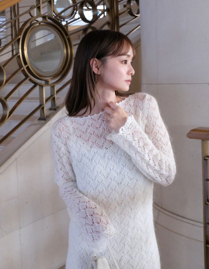 「繊細なニットドレスを主役に少し先のシーズンを先取りしてみました。繊細なモヘアとウールを使用したドレスはふわっとした質感と着心地のよさが特徴。1枚で着映える総レースのドレスを引き立てるように、小物は極力シンプルにまとめました。透け感のあるレース模様が女性らしいお気に入りの1枚です」