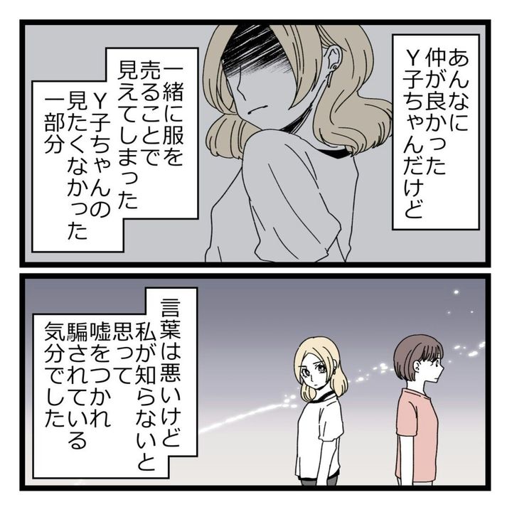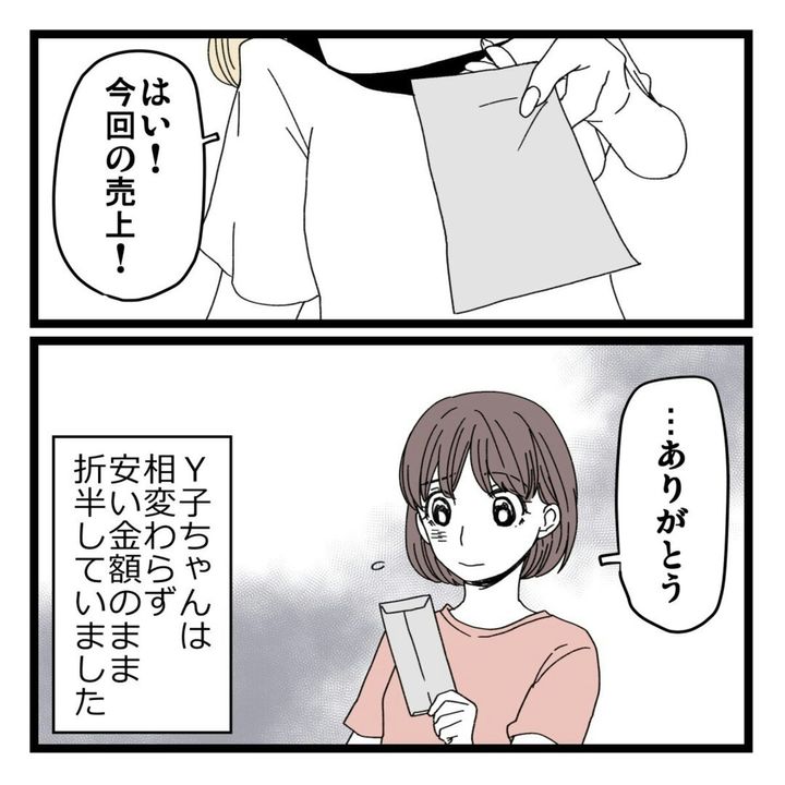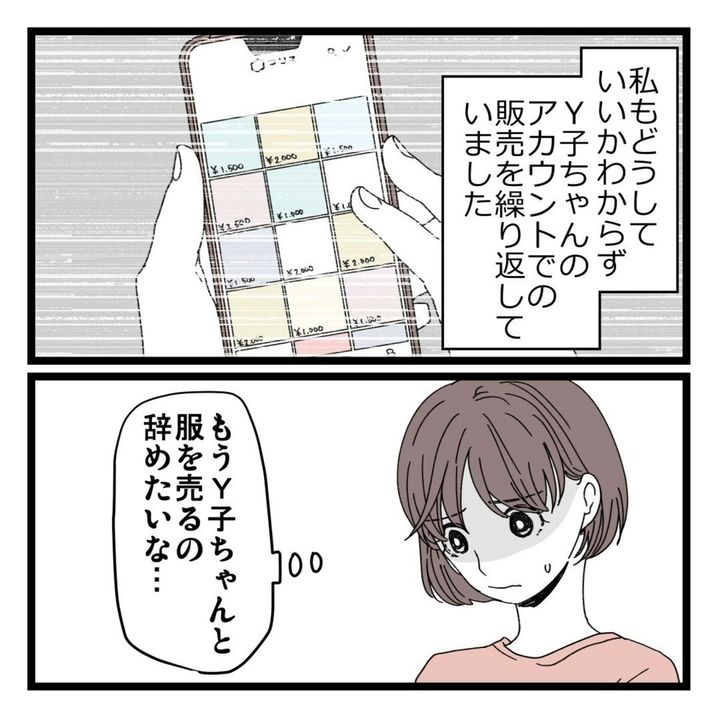 趣味でアクセサリーなどを販売している はに子さん。フリマ販売に興味を持ったY子さんの提案により、Y子さんのアカウントで子ども服の共同販売を始めることになりました。Y子さんセレクトの服は飛ぶように売れますが、アカウントをチェックしてみると、相談した価格より高値で売られている事実を知ってしまいました。しかも、勝手に値上げした分の売上は折半されていません。どうやら値上げ分はママ友が独り占めしているようです…。うそに気づき、Y子さんの知られざる一面を垣間見たことで、騙されているような気持ちは大きくなり、共同販売をやめることを決意します。山吹いろ・金銭トラブル漫画(@yamabuki___iro)さんによる作品『ママ友に半年間騙されていた話』第10話をごらんください。
