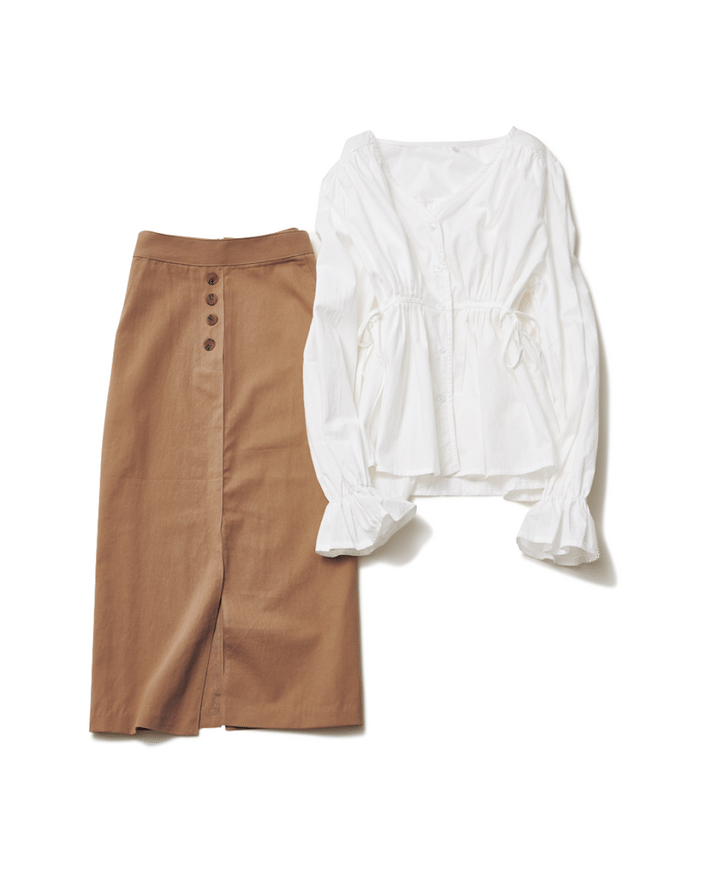 ボリューム袖フレアブラウス¥4,426〈N.VOGUE〉スリットタイトスカート¥5,880〈UPTOWNHOLIC〉(ともに3rd Spring)