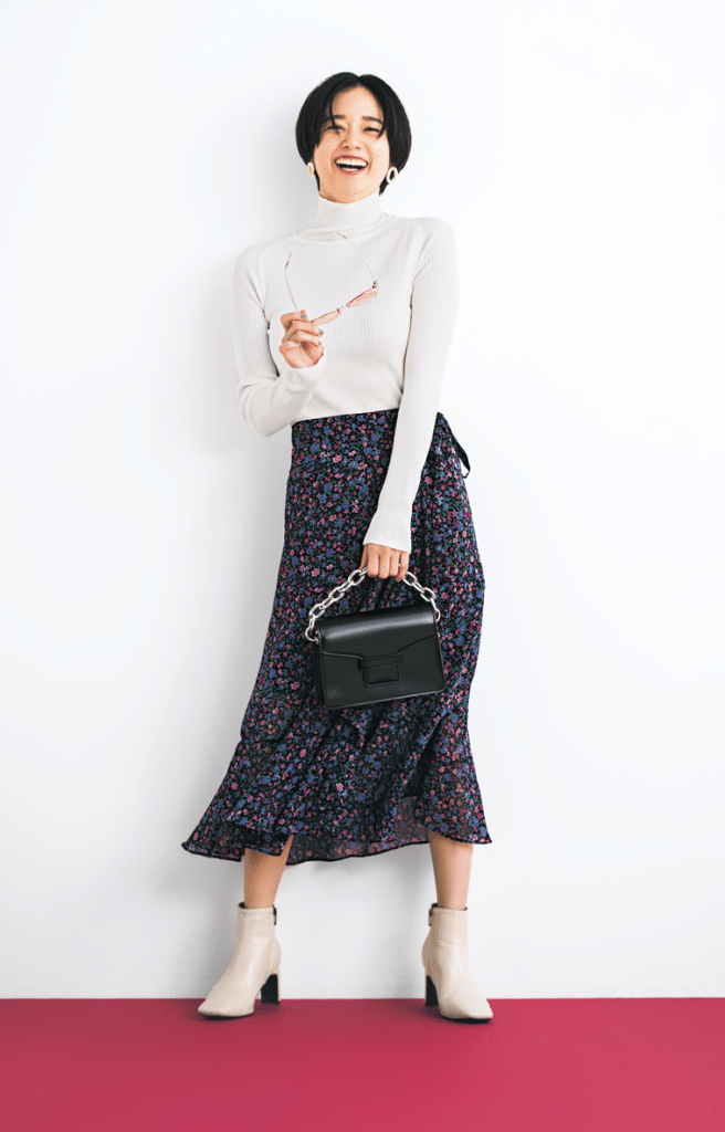 スリムラインタートネックニット¥4,160ラップスカート¥5,056(ともにIMVELY/PAGE-ONER)バッグ¥4,140ブーツ¥5,420サングラス¥1,980ピアス¥1,470(すべてDHOLIC LADIES/DHOLIC)