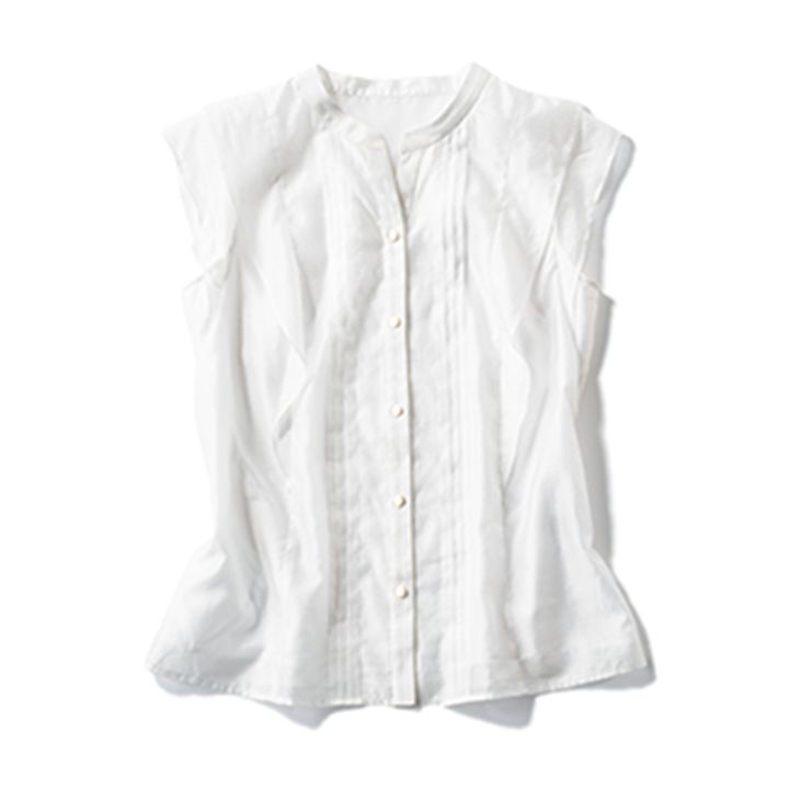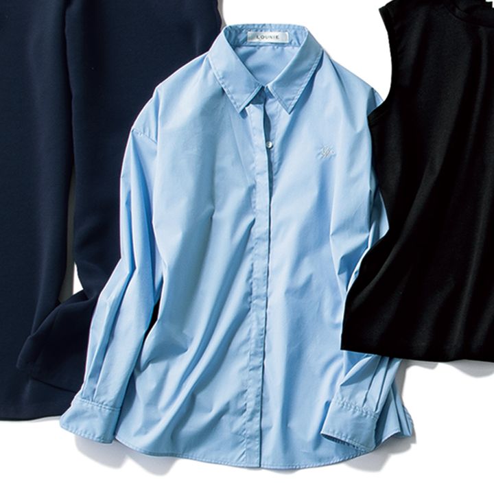 きちんと見えに貢献するハリ感シャツ。汗をかいても接触冷感機能で肌にまとわりつく感触を抑えてくれる、働くCLASSY.世代の味方。シャツ¥18,700(ルーニィ)