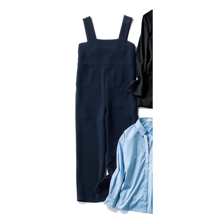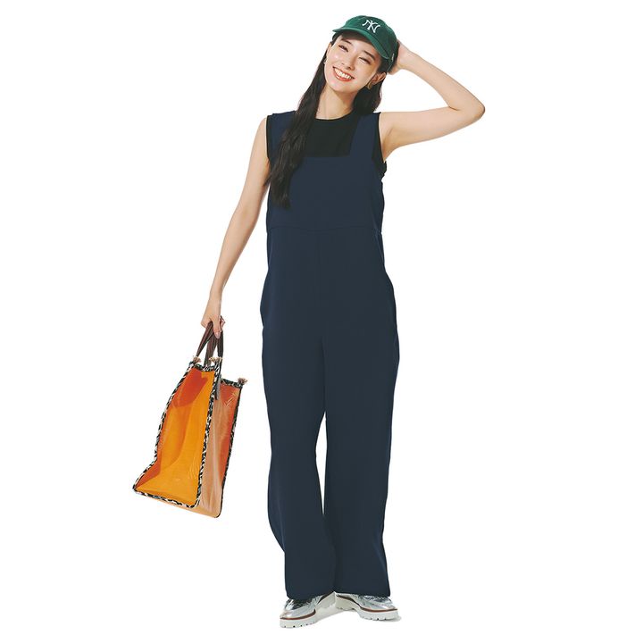 汗をかいても快適。高めの切り替え位置でぺたんこ靴でも脚長見え。サロペット¥25,300(ユナイテッドアローズ/ユナイテッドアローズ渋谷スクランブルスクエア店)