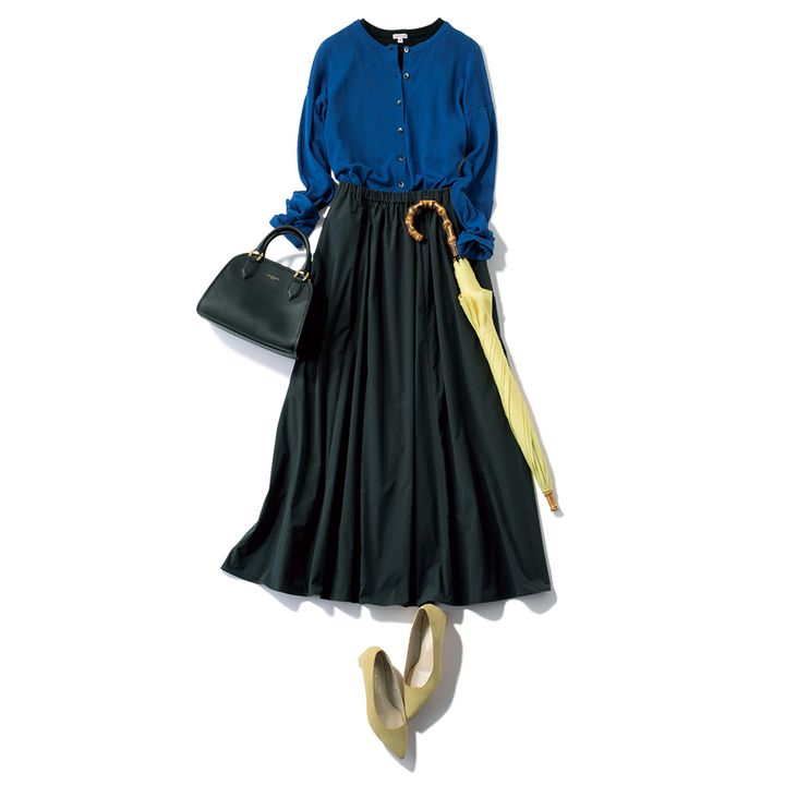 たっぷり使った生地とウエストギャザーでエレガントなボリューム感が生まれます。撥水機能付きで雨の日も◎。スカート¥17,600(emmi/エミ ニュウマン新宿店)