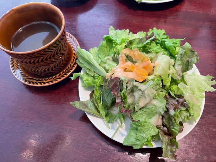 全てのメニューについてくる、サラダとスープ。サラダは玉ねぎや生姜が感じられる洋風なスープです。