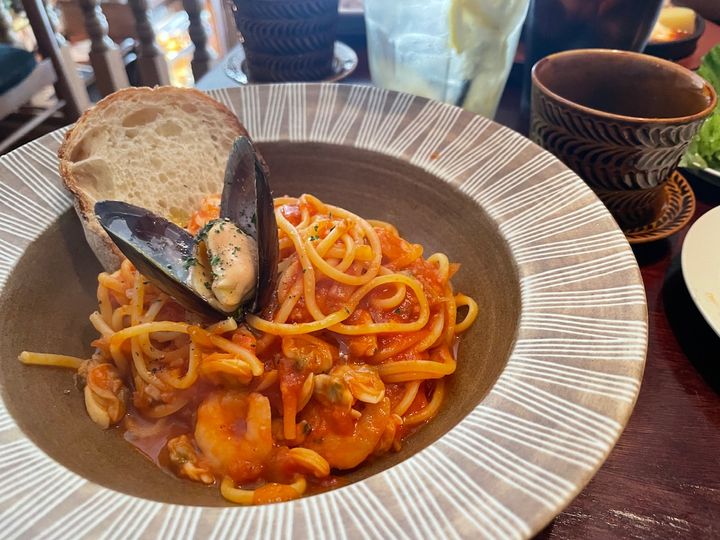 この日はエビや貝など、具もたっぷり入った魚介系のパスタ。 個人的にトマトが苦手なのですが、ここのトマトパスタはいい意味でトマトっぽさが薄いというか、他の調味料の味がいろいろと感じられてとても美味しくて、好んで選びます。 ドリンクだけでなく、お料理もどれも美味しいものばかりなので、好きなものを選んで間違いないと思います。