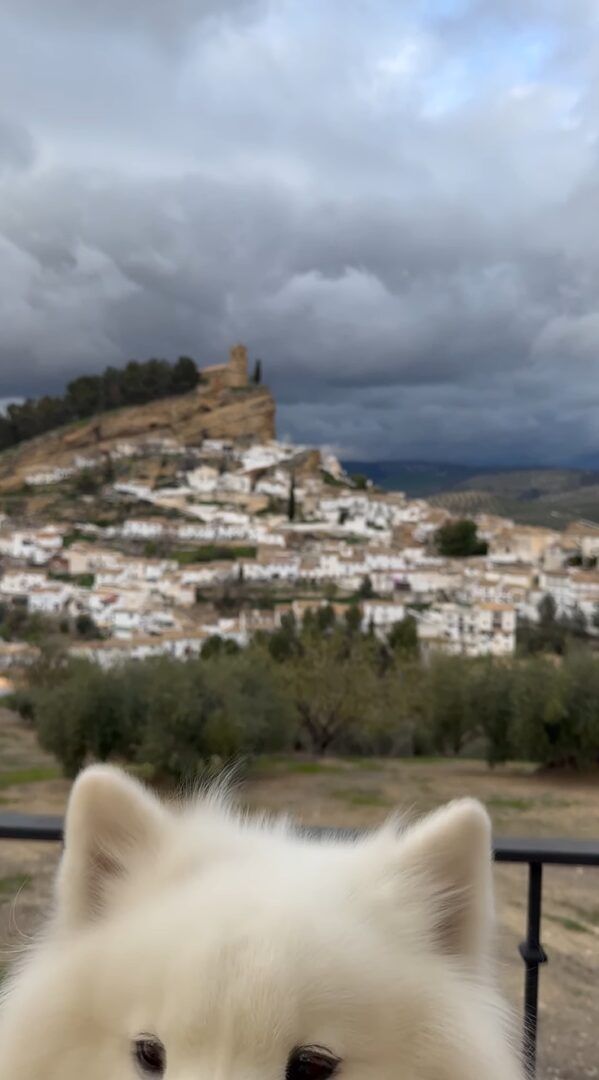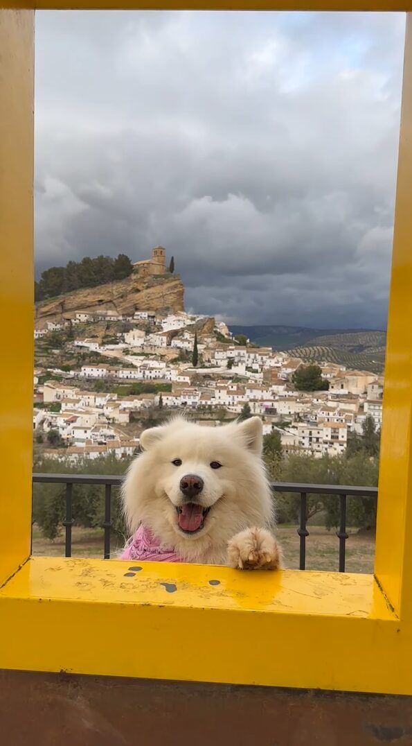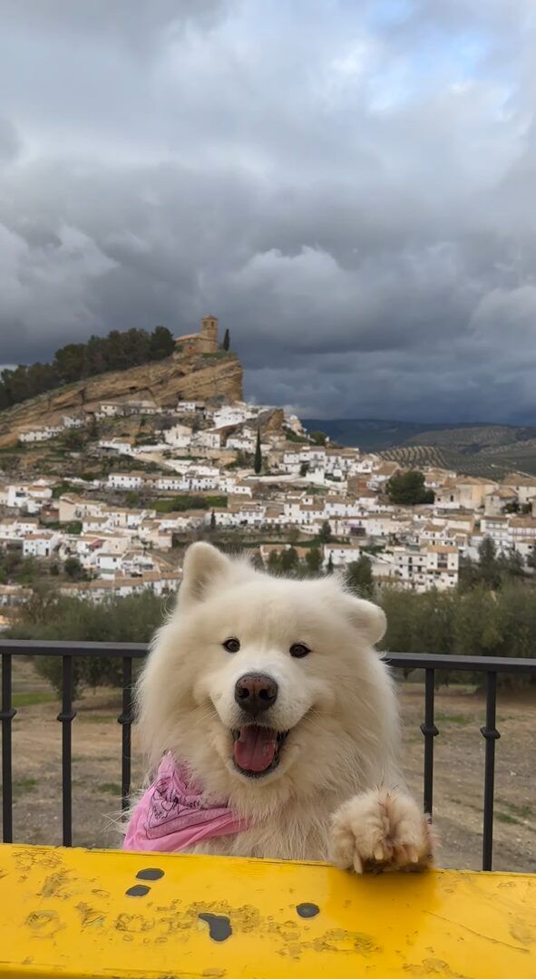 ヒョコッと顔を出した真っ白な笑顔のサモエド。 耳をピョコピョコ動かす様子がとてもかわいいですが、その向こうにはスペイン・モンテフリオの街並みをとらえた絶景が広がっています。