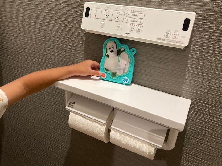 この「何が鳴るかわからない」ボタンが息子にヒットしたようで、トイレに誘うと「ワンワン押しにいく~!」と乗り気!