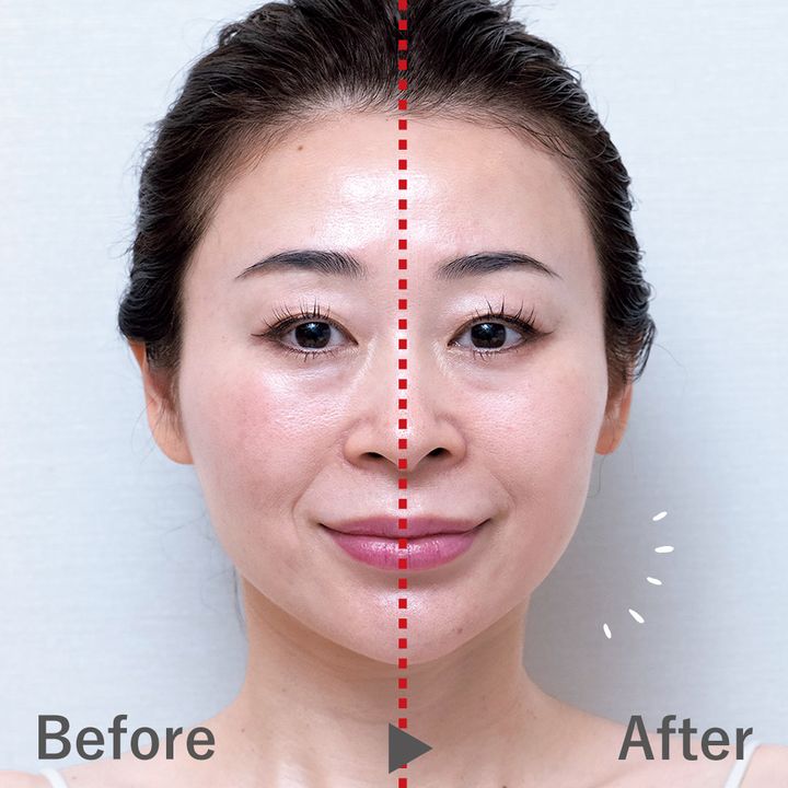 頭皮→顔にさっと塗り伸ばしただけで、目尻の位置、目の下のクマ、ほうれい線の高さと薄さに歴然の差が!(中川 梢さん・42歳)