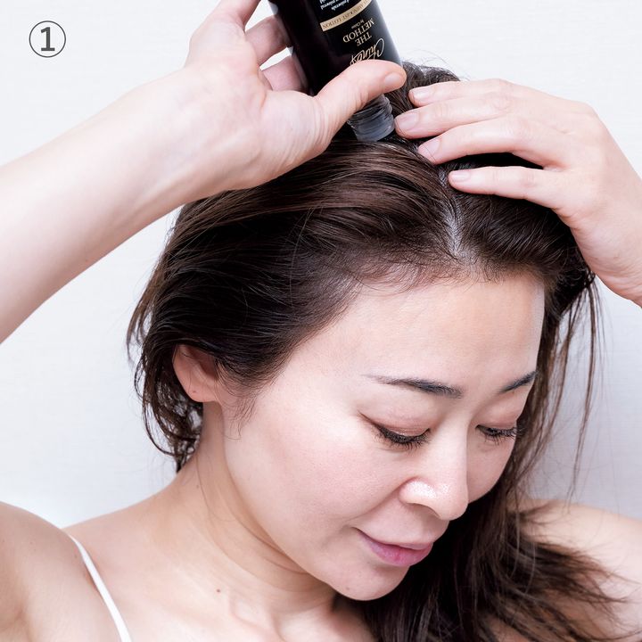 お風呂上がりにタオルドライした後、頭皮にボトルから直接何カ所かつけ、軽く伸ばし、髪を乾かします。