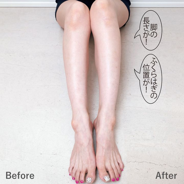 足先から脚の付け根まで優しく塗り伸ばしただけで、捻りが軽減。膝下の長さが少し伸び、ふくらはぎの位置が上がりました。