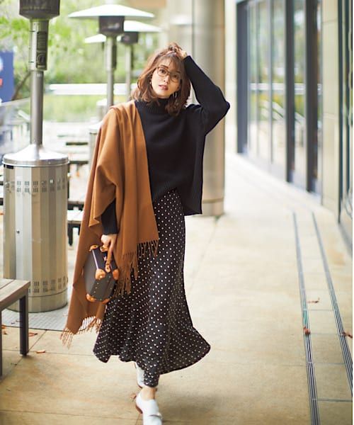 ニット¥27,000(OUTERSUNSET)スカート¥62,000(THIRD MAGAZINE/THIRD MAGAZINE)キャメルストール¥69,000(ベグ アンド コ ー/ボーダレス)眼鏡¥34,000(アイヴァン/アイヴァン PR)ピアス¥70,000(ウノアエレ/ウノアエレ ジャパン)リング¥4,500(ラ ピュイ/キャセリーニ)シューズ¥92,000(サントーニ/リエート)バッグ¥120,000(グローブ・トロッター/グローブ・トロッター 銀座)