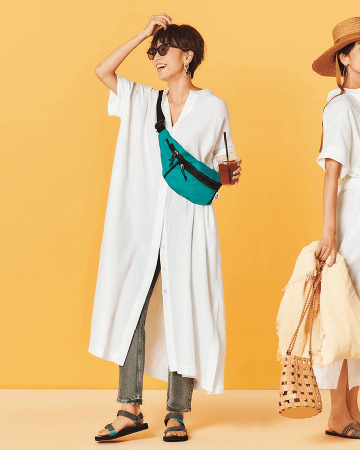 ワンピース¥30,000(LE PHIL/LE PHIL NEWoMan新宿店)デニムパンツ¥23,000(アッパーハイツ/ゲストリスト)サングラス¥36,000(アイヴァン/アイヴァン PR)ピアス¥25,400(クレド/シップス 大宮店)サンダル¥6,300(テバ/デッカーズジャパン)ウエストポーチ¥6,000(ドリフター/リフト)