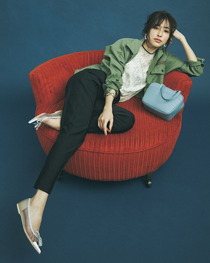 ブラウス¥9,900(SNIDEL/SNIDEL ルミネ新宿2店)ジャケット¥36,300(RHC/RHC ロンハーマン)パンツ¥31,900(フリッカ/フリッカ インターナショナル)バッグ¥25,300(サマンサタバサプチチョイス/サマンサタバサ プチチョイスプラス 渋谷ヒカリエShinQs店)パンプス¥28,600(プリティ・バレリーナ/F.E.N.)イヤリング¥7,020(アビステ)バングル¥22,000(フォークバイエヌ/UTS PR)
