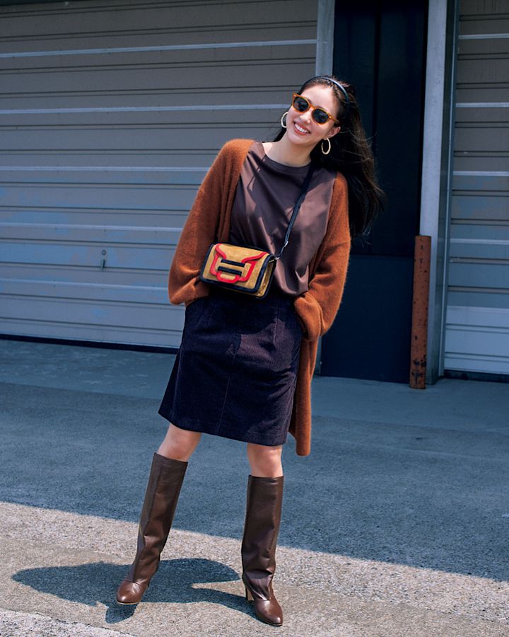 ロングブーツ¥94,600(ネブローニ/フラッパーズ)ロングニットカーディガン¥9,900(ビーミング by ビームス/ビーミング ライフストア by ビームス 横浜ポルタ店)Tシャツ¥12,100(カデュネ/カデュネ プレスルーム)コーデュロイミニスカート¥15,400(アンクレイヴ)バッグ¥107,800(ピエール アルディ/ピエール アルディ 東京) カチューシャ¥2,200(フリークス ストア/フリークス ストア渋谷)サングラス¥35,200(アイヴァン/アイヴァン 東京ギャラリー)ピアス¥9,350(メルセデス サラザール/ZUTTOHOLIC)