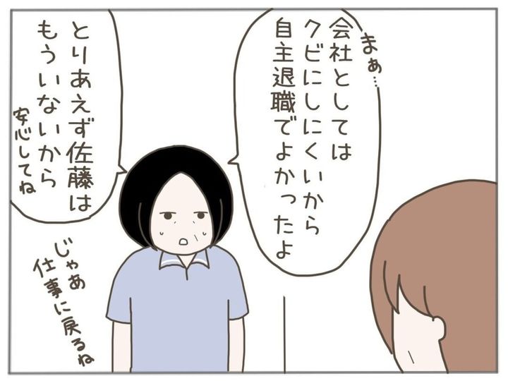 どうやら佐藤くんは自主退職したということだったようです。何はともあれ、佐藤くんが会社を去ったことで、ミキ子さんも安心して働けるようになったはず。