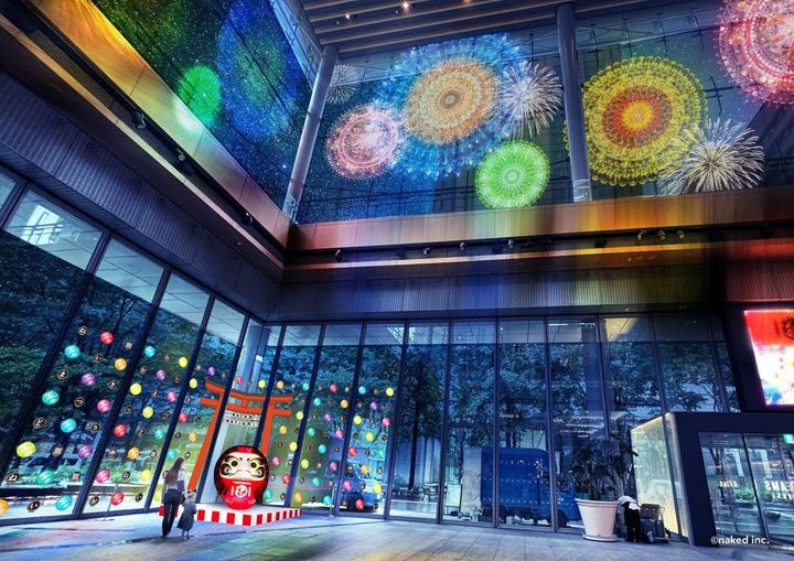 同じ建物1階のマルキューブには、群馬県高崎市の老舗「今井だるま」とコラボしたアートが展示されます。夜には丸ビルの窓にプロジェクションマッピングの花火が映し出される演出も。
