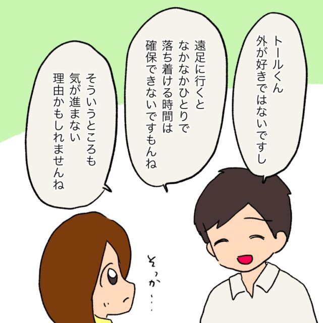 「トールくん外が好きではないですし、遠足に行くとなかなかひとりで落ち着ける時間は確保できないですもんね。そういうところも気が進まない理由かもしれませんね」