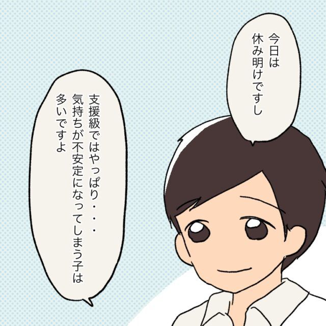 「今日は休み明けですし、支援級ではやっぱり・・・気持ちが不安定になってしまう子は多いですよ」