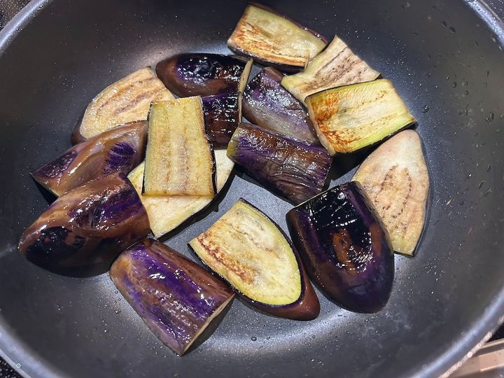 ③フライパンにごま油を引いたら熱し、ナスを炒めたら一度取り出し、次にピーマンを炒める。