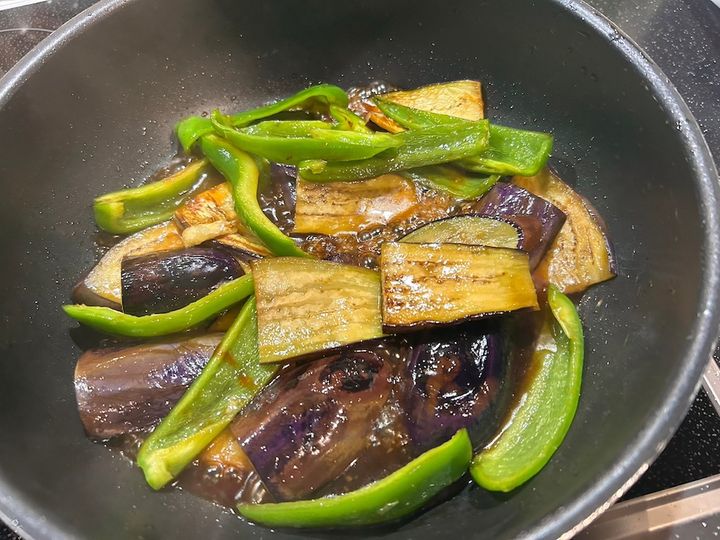 ④ピーマンにいい感じの焼き色がついたらナスを戻し、混ぜ合わせておいたタレを入れて1分ほど炒め合わせたら完成です。