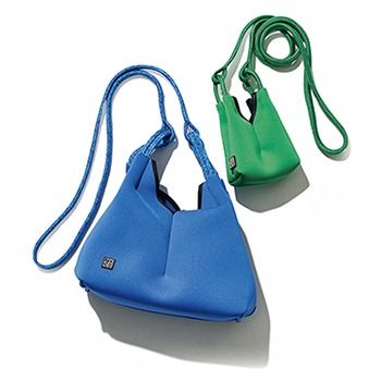 グリーンバッグ 36,300円、ブルーバッグ 53,900円/ともにステート オブ エスケープ(サザビーリーグ) ふっくらとクッションのように柔らかい素材感。さし色としてもちょうどいいヴィヴィッドカラーとサイズ感。