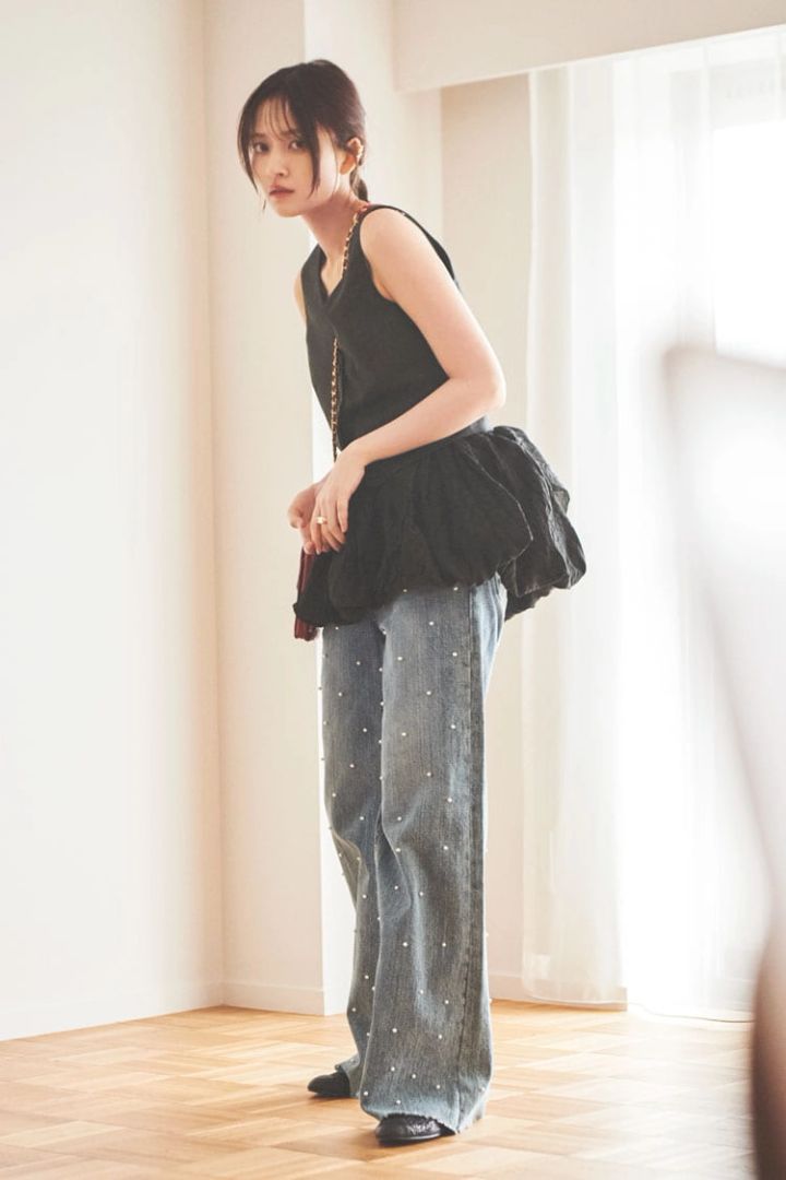 パールつきデニムパンツ 27,500円/The Girls Society ブラックストライプベスト 13,750円/MIDNIGHT MOVE(ALAND/アダストリア) ブラックバルーンキャミソール 23,100円/HONEY MI HONEY バッグ 11,000円/ダイアナ(ダイアナ 銀座本店) ゴールドコネクトイヤカフ 2,200円、ゴールドディストートクリアモチーフリング 2,090円/ともにGOLDY ブラックグリッターシューズ 57,200円/YIEYIE(SHOWROOM CHRMR)