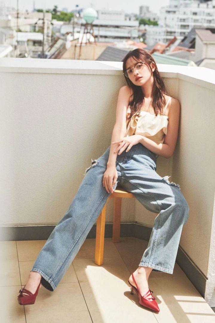 サイドカットアウトデニムパンツ 15,400円/EATME原宿本店 アイボリーリボン2wayトップス 17,600円/HONEY MI HONEY めがね 41,800円/SPRING STRINGS(SHOWROOM CHRMR)レッドベルトパンプス 11,900円/NADIA FLORES EN EL CORAZON