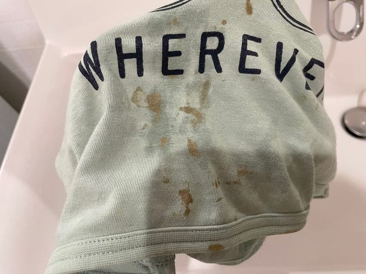 下の画像は、わが家で毎日の出来事、子どもの洋服の食べこぼしの汚れです(汗)。