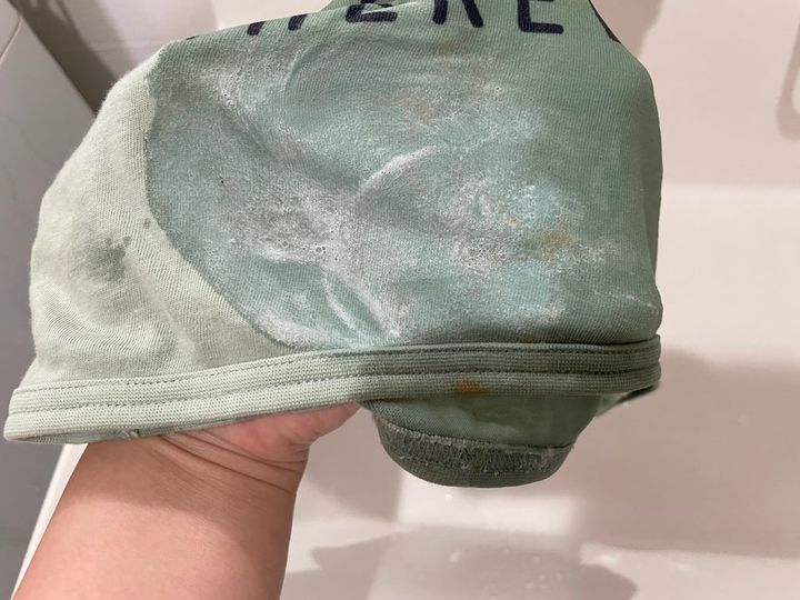 まずは、洋服の汚れている部分を水で濡らして、固形石鹸を馴染ませました。