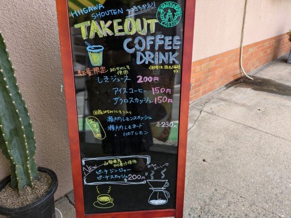 去年お店を改装し、リニューアルオープンをきっかけに、テイクアウトのドリンクも販売するようになったとのこと!幟には「コーヒー」と書かれていたのですが、よく見たら様々なドリンクがあるようです。