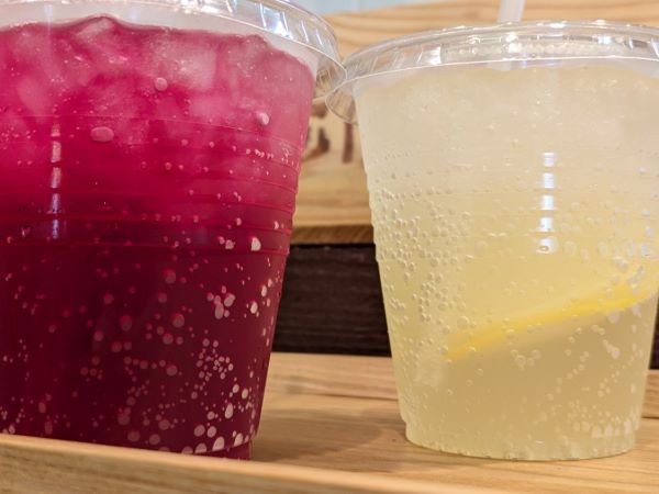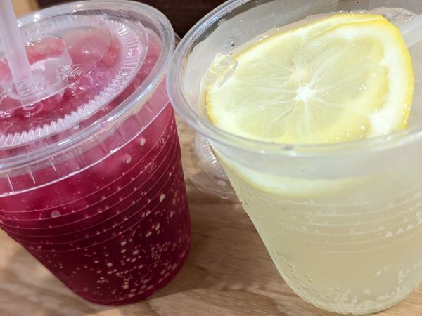 どれも美味しそうなので迷ったのですが、6月下旬から販売している「しそジュース」と、「レモン系のドリンク」がお勧めとのこと。しそジュースに使っている赤紫蘇は、福岡県遠賀郡芦屋町で採れた「あたかの紫蘇」という、赤紫蘇の中でも最高級品種のものなのだそうです。そして、レモン系の3種類のジュースには、瀬戸内レモンを自家製で蜂蜜漬けしたものを使っているそうです。 これだけこだわった材料を使ったドリンクが1杯200円くらいだから、きっと量も少な目で2杯くらい軽くいけちゃうはず♪と「しそジュース」と「瀬戸内レモネード」をオーダーすることにしました。 お会計を済ませ、待つこと数分。あら~!ビッグサイズです!コップの高さは約9センチ。そして、とってもキレイな色に、テンションマックスです。