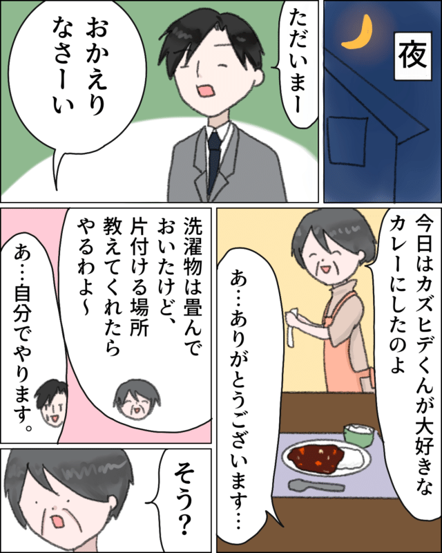 突然アズサさんのお母さんが泊まりでやってきて家事・育児の手伝いを始め、カズヒデさんは落ち着かない様子ですが、そんなことはお構いなしでアズサさんは「しばらくいてもらう」と宣言したのでした。