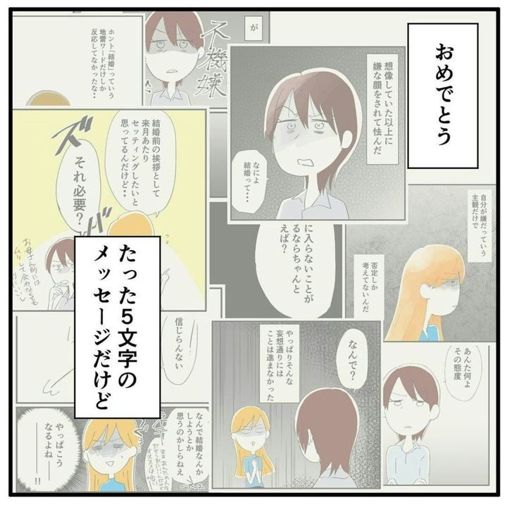 結婚の報告をしたとき、母親の反応はどのようなものでしたか。結婚という人生で大きな選択をしたのですから、祝福をしてくれたらうれしいですよね。一方、反対されたり祝福されなかったりすると、つらい気持ちになることも。大人になっても親は親。とても近い存在だからこそ、娘の幸せを祝ってほしいと思うでしょう。今回ご紹介する作品は、高宮(@takamiya0501)さんが実際に経験した結婚報告のエピソード。『結婚報告をしたら母と険悪になった話』をご紹介します。